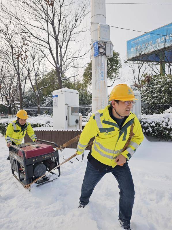 装维东谈主员手拉发动机在雪地里行走。安徽移动供图