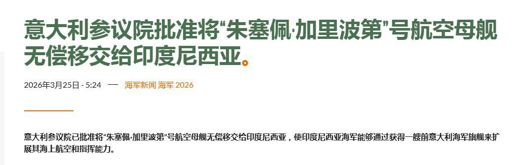3月24日,意大利盘考院稳健通过部长级划定,批准将退役轻型航母“朱塞佩・加里波第”号无偿移交给印度尼西亚舟师,两边也稳健进入移交要津,瞻望在2026年10月完成一齐布置使命。