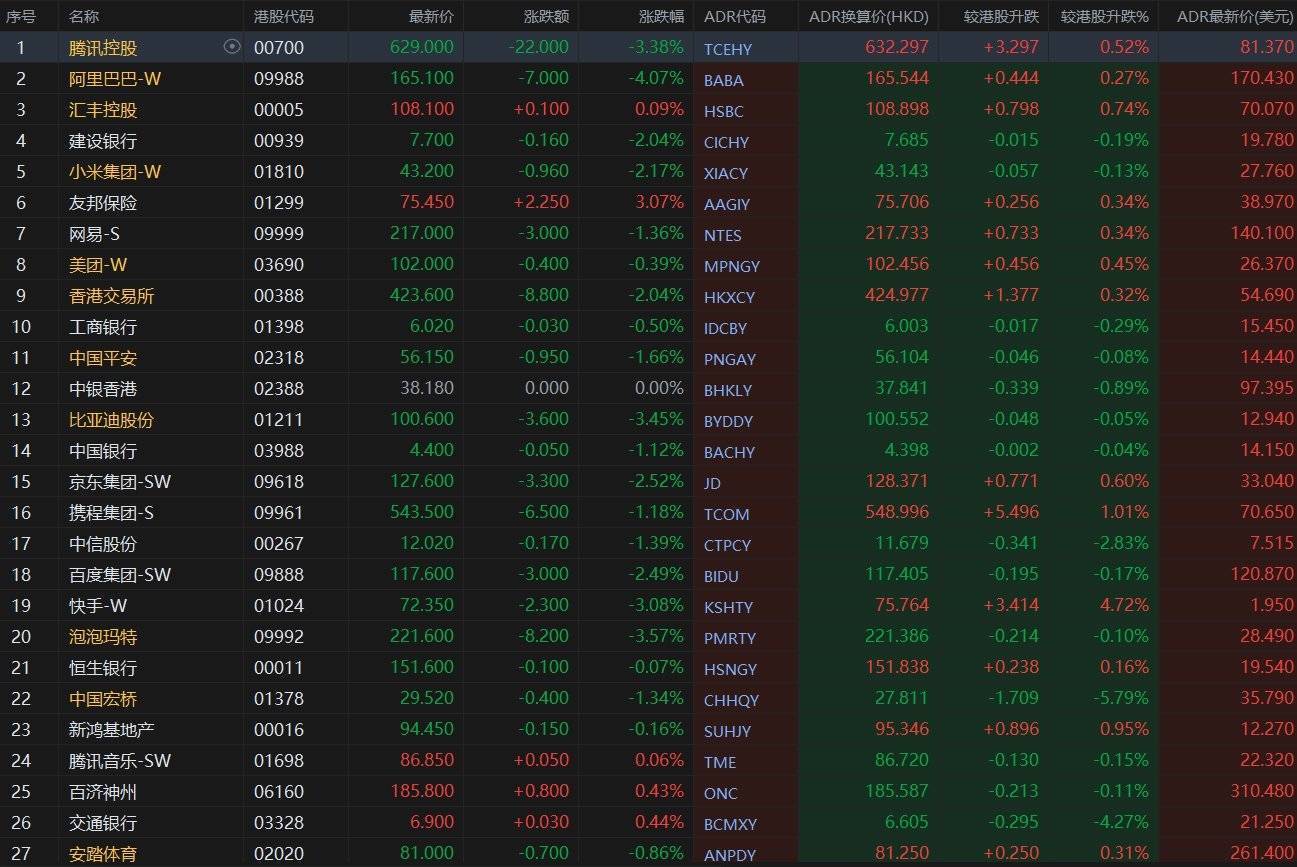大型蓝筹股涨跌不一,汇丰控股收报108.898港元,较香港收市涨0.74%;腾讯控股收报632.297港元开yun体育网,较香港收市涨0.52%。