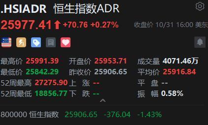 智通财经APP获悉,周五,好意思股三大指数集体高涨。恒生指数ADR高涨,按比例筹算,收报25977.41点开yun体育网,较香港收市涨70.76或0.27%。
