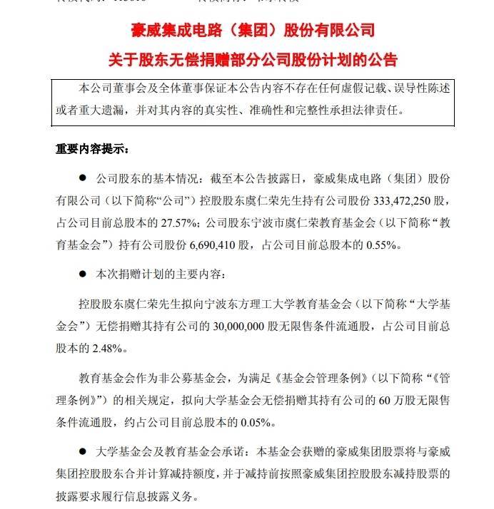 2023年12月5日,韦尔股份再度公告,绍兴韦豪野心向宁波东方理工大学教养基金会无偿捐赠1000万股无尽售要求灵通股,按其时股价,该次捐赠对应市值超10亿元;